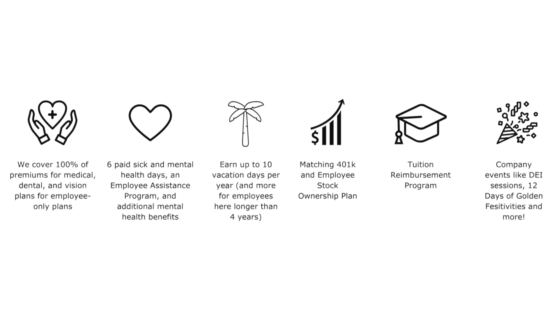 That starts with ensuring our employees have access to our award-winning health benefits. Our comprehensive coverage for employee-only health plans, flexible work arrangements, matching 401k, and an Employee Ownership Plan, ensures that our team members live fulfilling and healthy lives. But it doesn’t stop there, here’s an overview of what we offer…